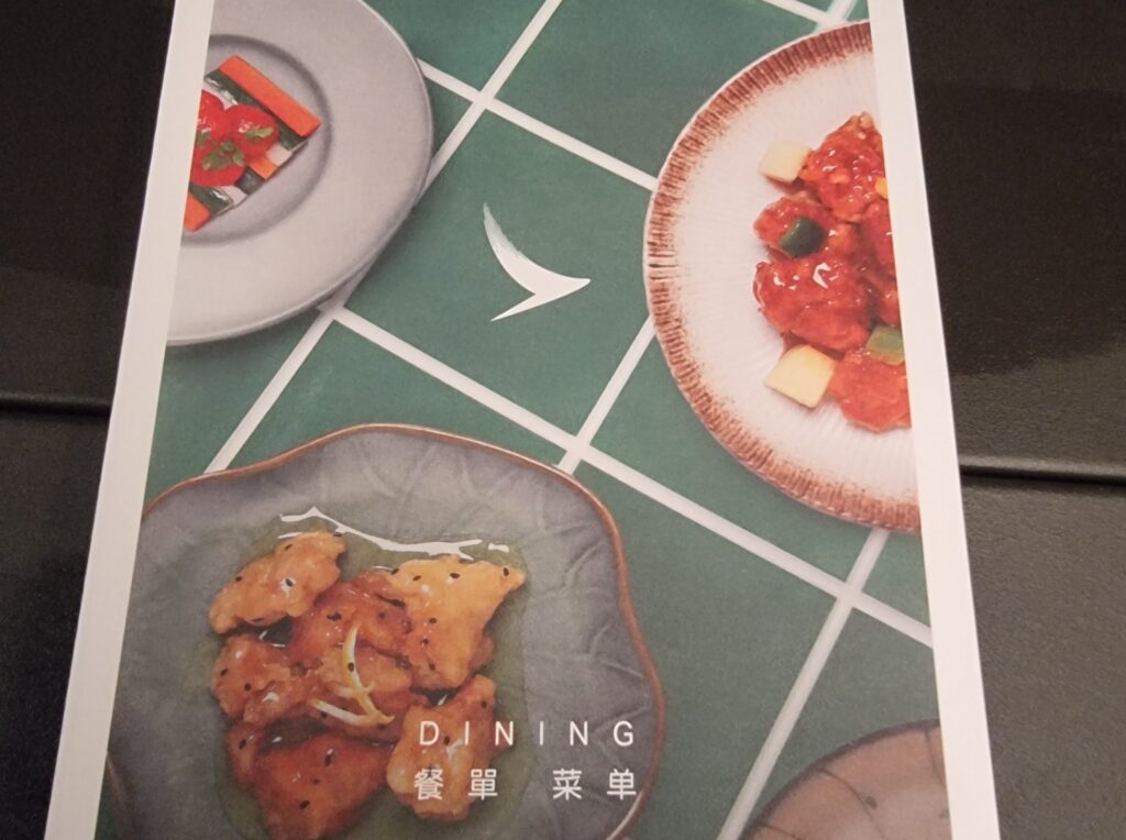 「ミシュランの星付きレストラン監修の香港の味覚」が歌い文句の料理。そして美しい装丁のメニューが配られかなり期待していたのですが、そこまで美味しいとは思えませんでした。メインはまあまあ、突き出しやサラダはかなり微妙で私の家族も含めて結構な数の乗客が残していました。